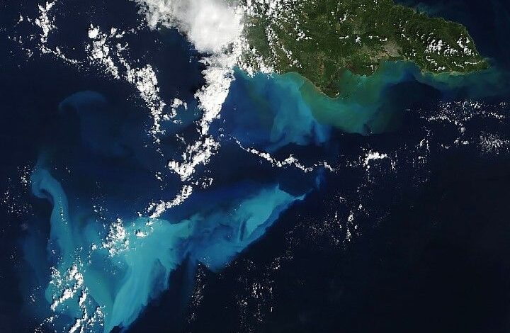 Pedro Bank is deep enough that it is only faintly visible in natural color satellite images most of the time. However, with enough disruption from hurricanes or strong cold fronts, its existence becomes more evident to satellites. Suspended calcium carbonate (CaCO3) mud, consisting primarily of remnants of marine organisms that live on the plateau, turns the water a Maya blue color. The appearance of this type of material contrasts with the greenish-brown color of sediment carried out to sea by swollen rivers on Jamaica’s southern coast.