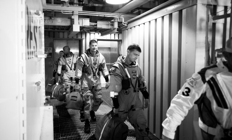Artemis II crewmembers (left to right) NASA astronauts Christina Koch, mission specialist; and Victor Glover, pilot; CSA (Canadian Space Agency) astronaut Jeremy Hansen, mission specialist; and NASA astronaut Reid Wiseman, commander are led to the crew access arm as they prepare to board their Orion spacecraft atop NASA’s Space Launch System rocket during the Artemis II countdown demonstration test on Dec. 20, 2025.