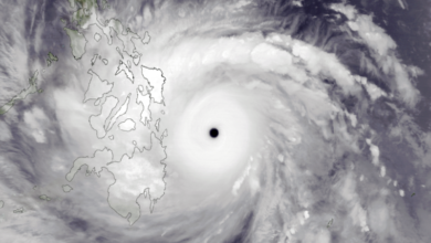 Satellite view of Super Typhoon Haiyan, just before it reached maximum intensity, on November 7, 2013. The outline of the…